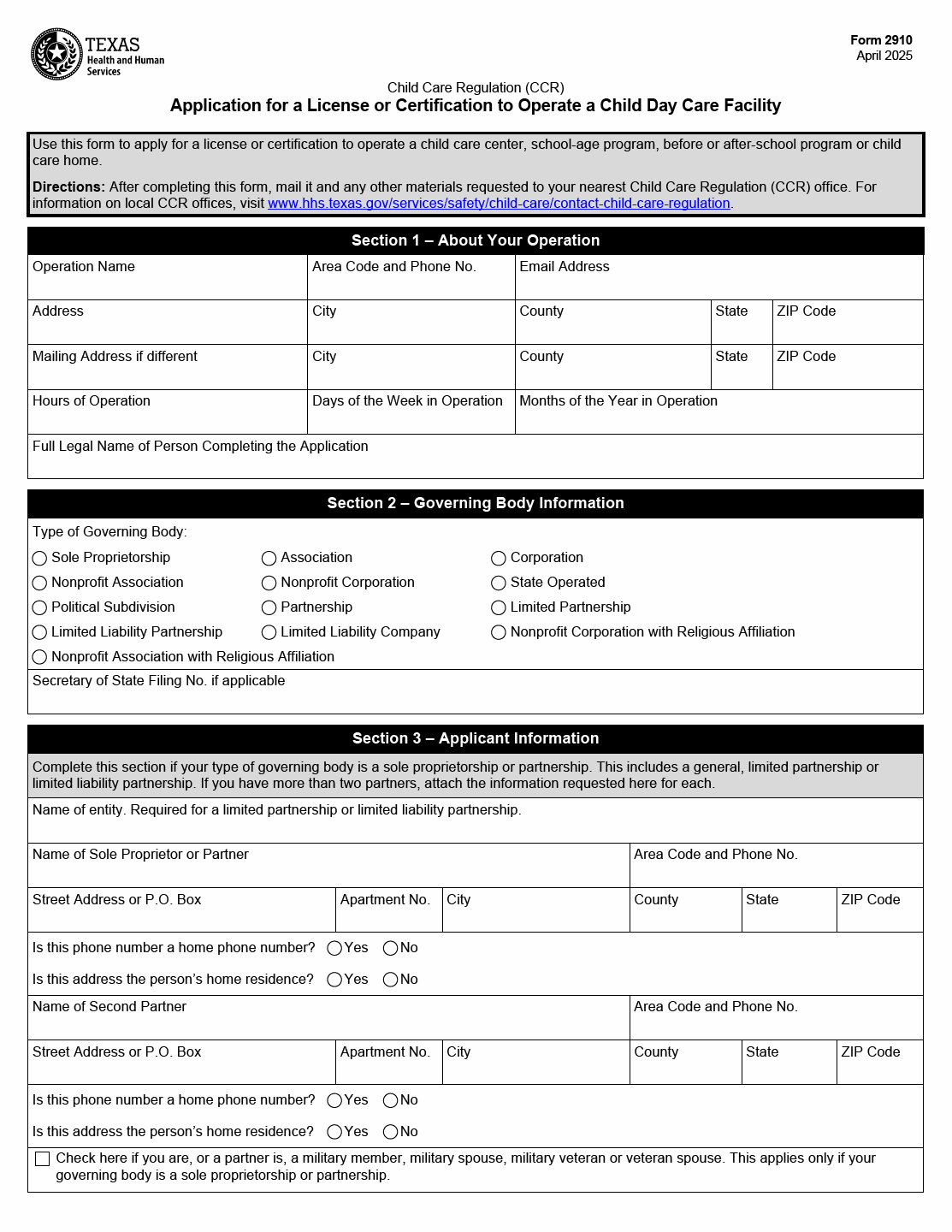 TX HHS Form 2910. CCR Application for a License or Certification to Operate a Child Day Care Facility