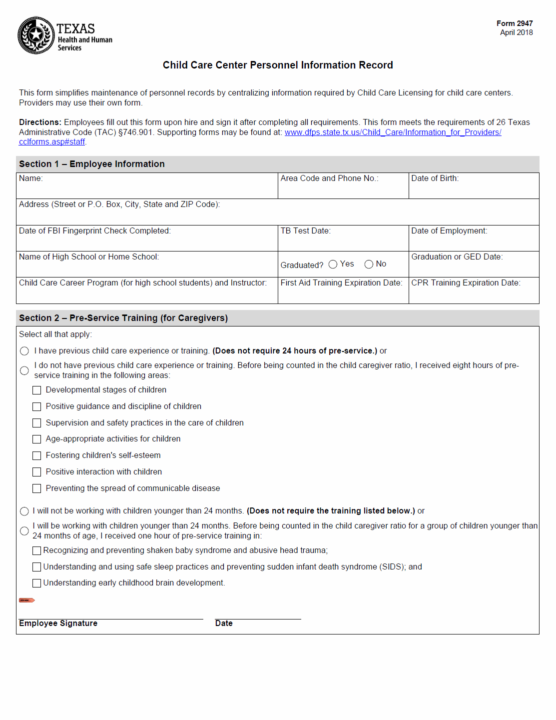 TX HHS Form 2947. Child Care Center Personnel Information Record