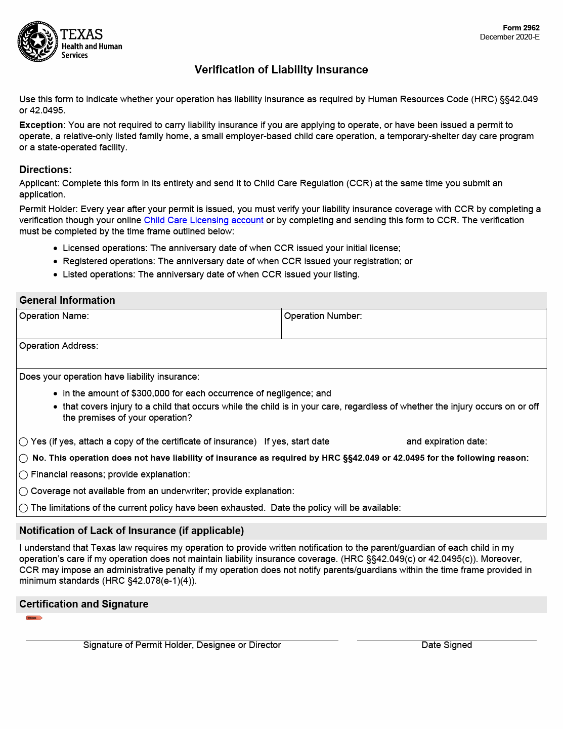Form 2962 is grounded in Texas Human Resources Code §§42.049 and 42.0495, which mandate disclosure of liability insurance status for child care operations. The law aims to increase transparency and protect families by ensuring they understand whether the provider carries sufficient coverage.