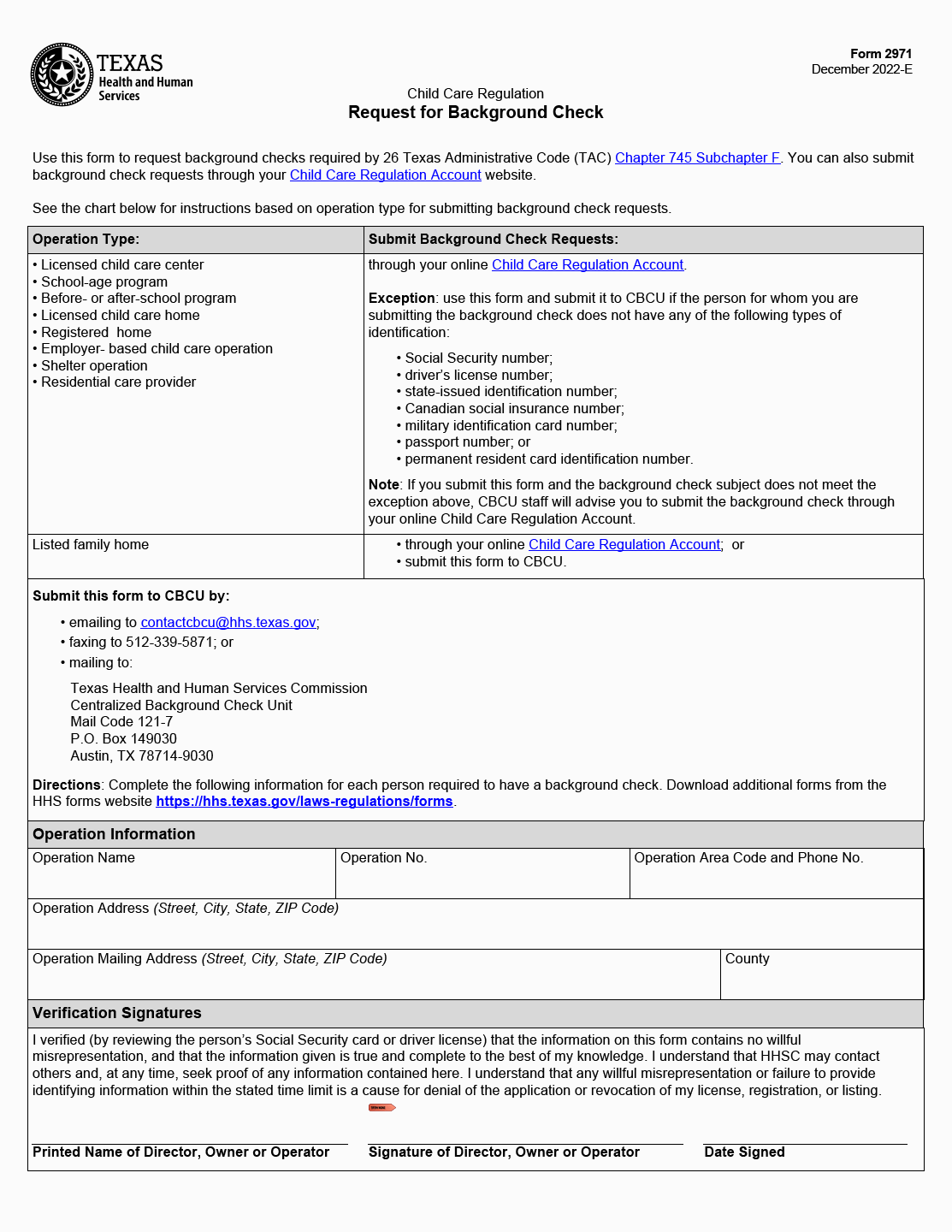 TX HHS Form 2971. Child Care Regulation Request for Background Check