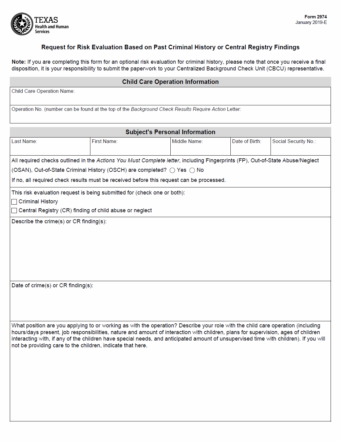 TX HHS Form 2974. Request for Risk Evaluation Based on Past Criminal History or Central Registry Findings