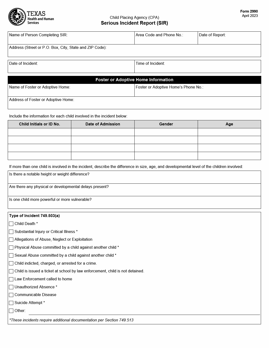 TX HHS Form 2990. Child Placing Agency (CPA) Serious Incident Report (SIR)