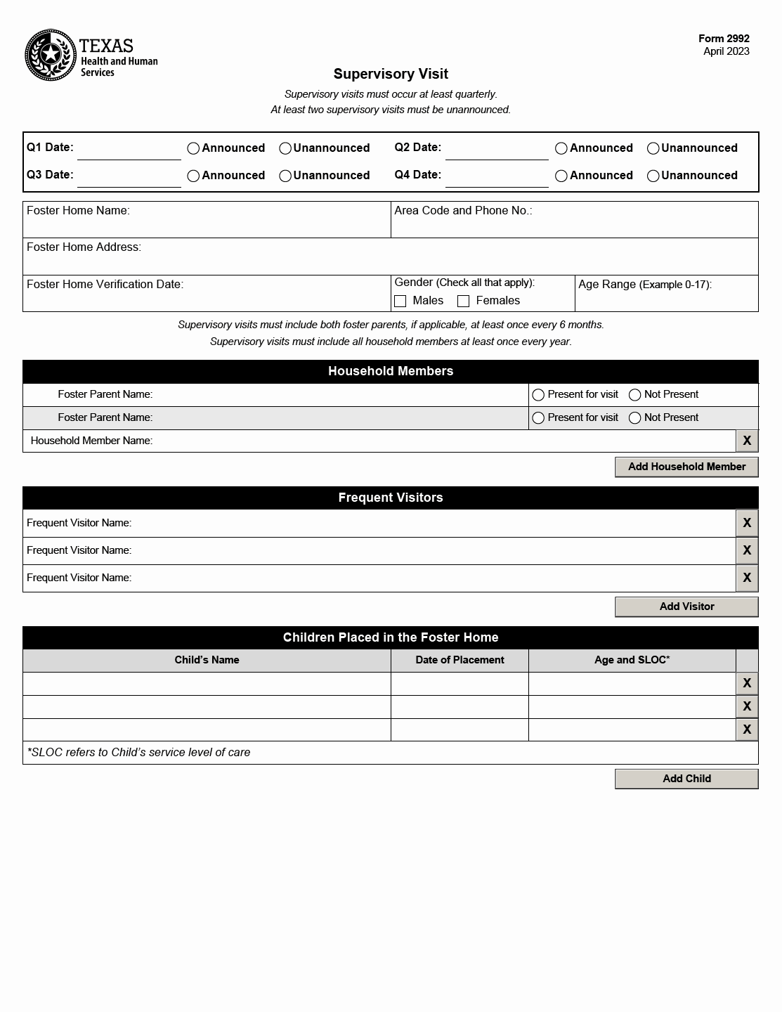 This form requires essential information such as the foster home name, address, verification date, gender, age range, and household members' names. It also includes sections for frequent visitors and children placed in the foster home. The form emphasizes the importance of including both foster parents at least once every six months and all household members at least once a year.