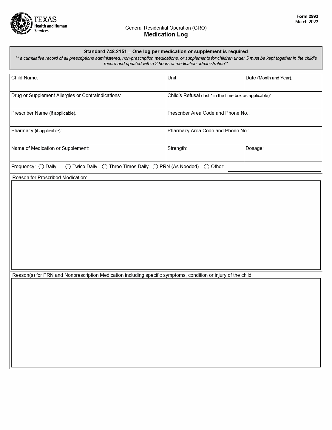TX HHS Form 2993. General Residential Operations Medication Log