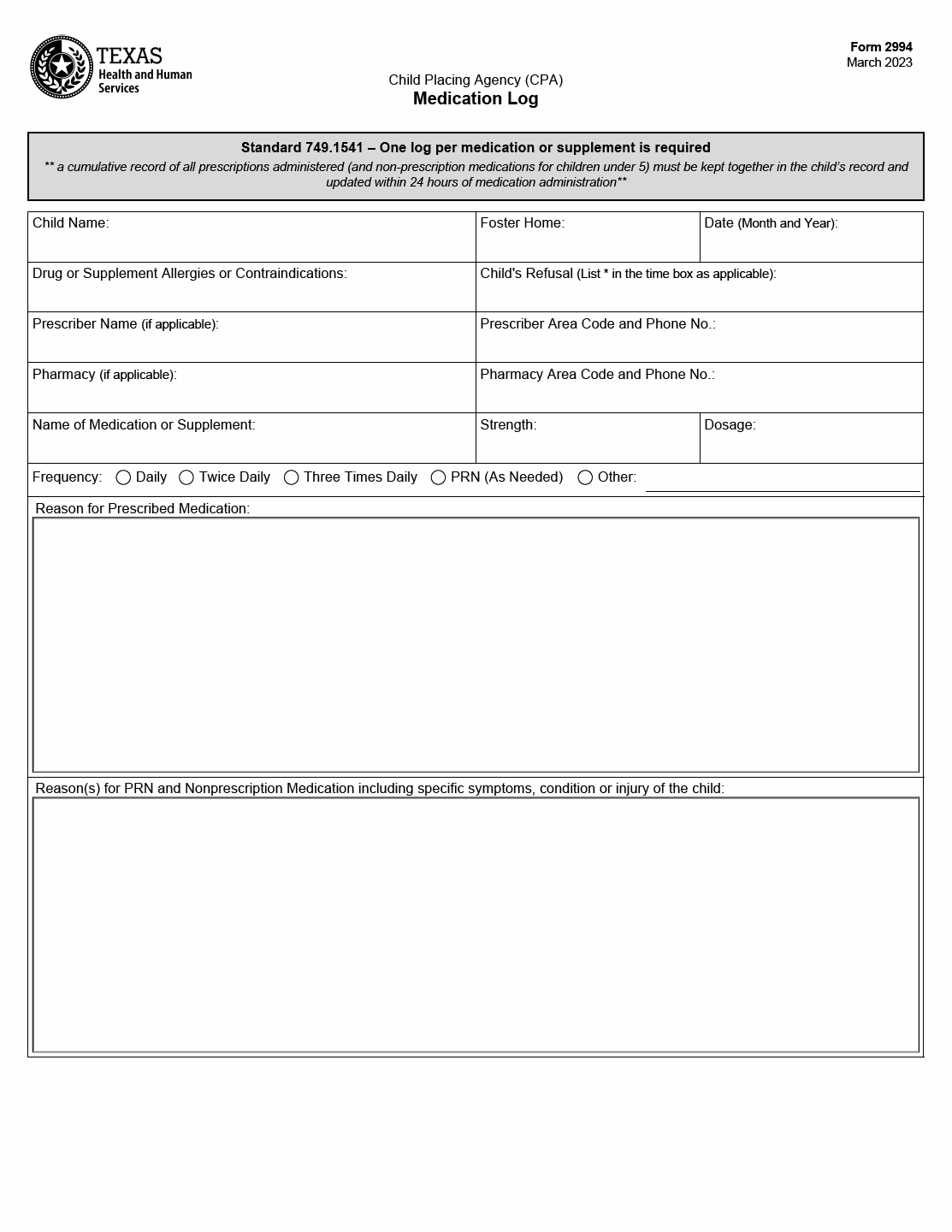 TX HHS Form 2994. Child Placing Agency (CPA) Medication Log