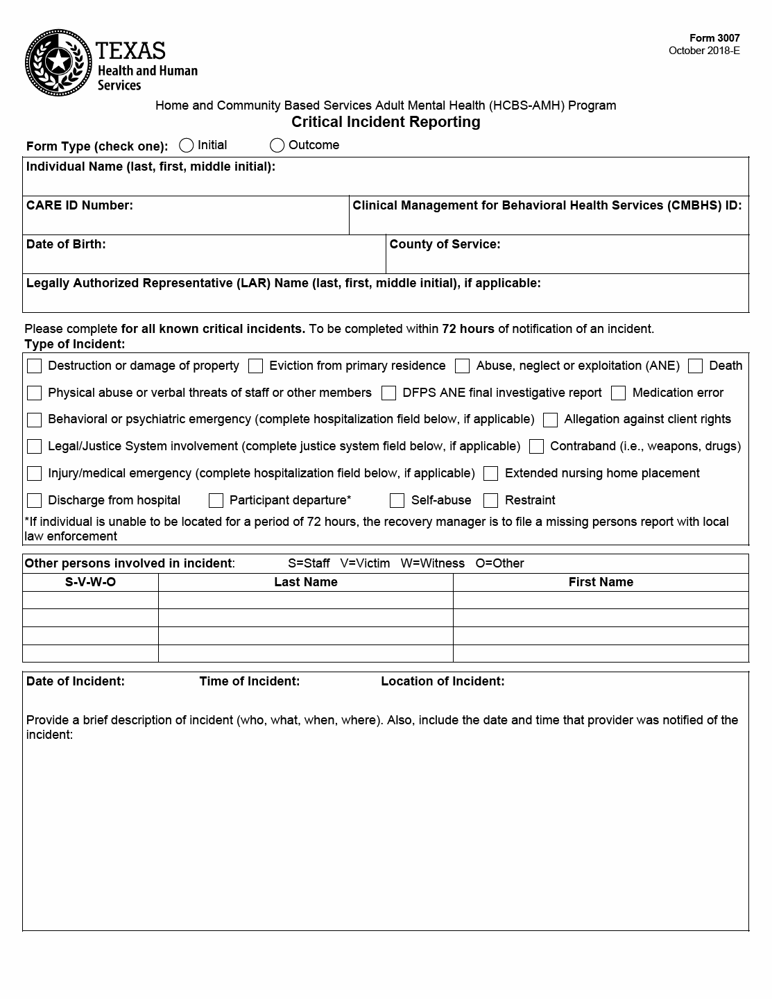 The TX HHS Form 3007, Critical Incident Reporting, is a crucial tool for reporting and documenting critical incidents that occur in Adult Mental Health (HCBS-AMH) Program services. This form helps providers and caregivers respond promptly to unexpected events, ensuring the well-being and safety of clients.