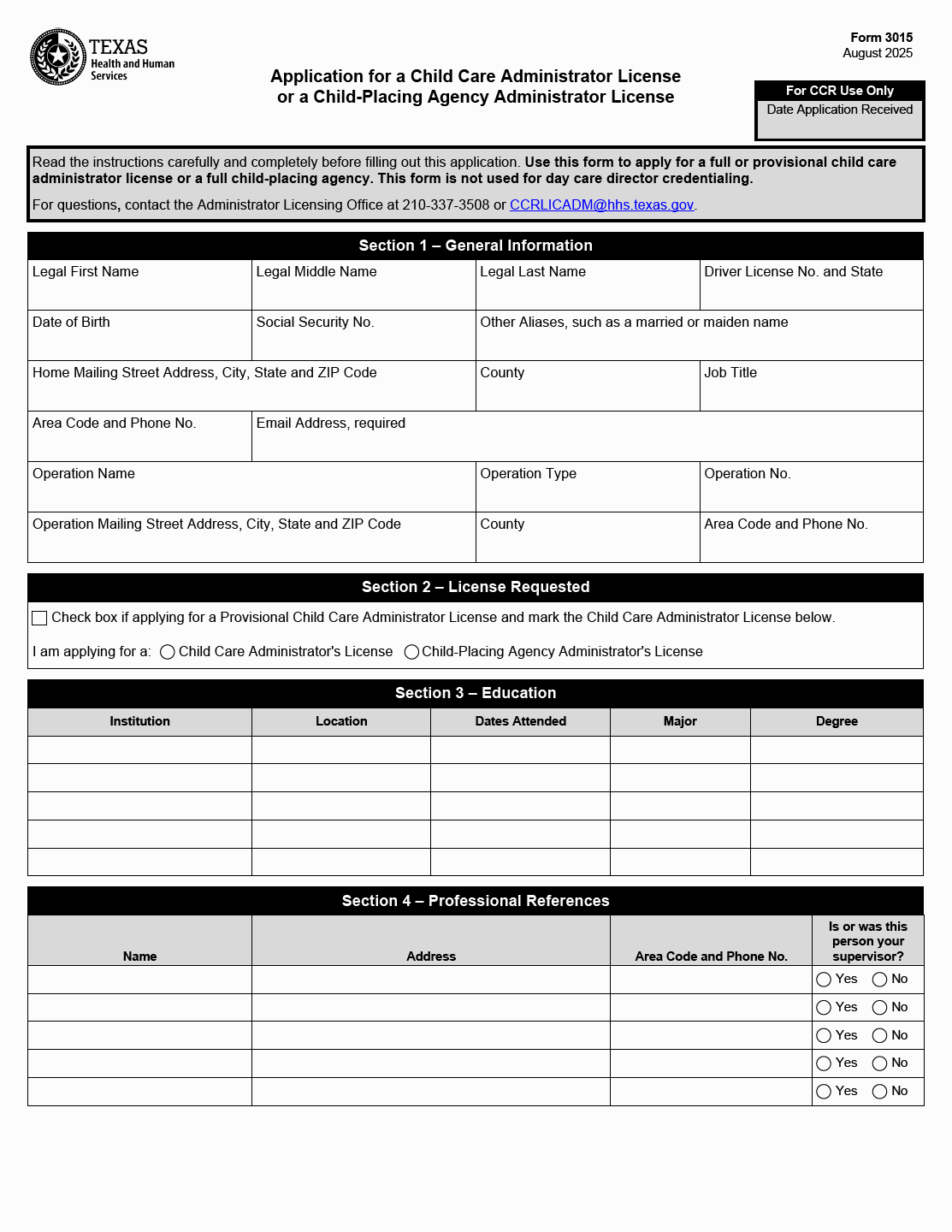 TX HHS Form 3015. Application for a Child Care Administrator License or a Child-Placing Agency Administrator License