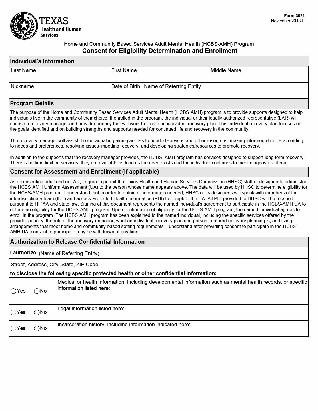 TX HHS Form 3021. Consent for Eligibility Determination and Enrollment