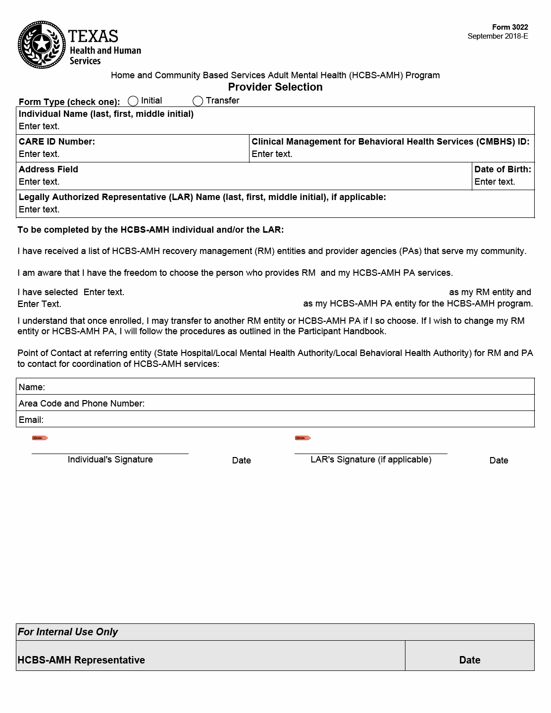 The TX HHS Form 3022, Provider Selection, is a crucial document that helps individuals select their preferred provider agencies (PAs) for Adult Mental Health (HCBS-AMH) services. This form should be completed by the individual or their Legally Authorized Representative (LAR) to choose the PA that best suits their needs.