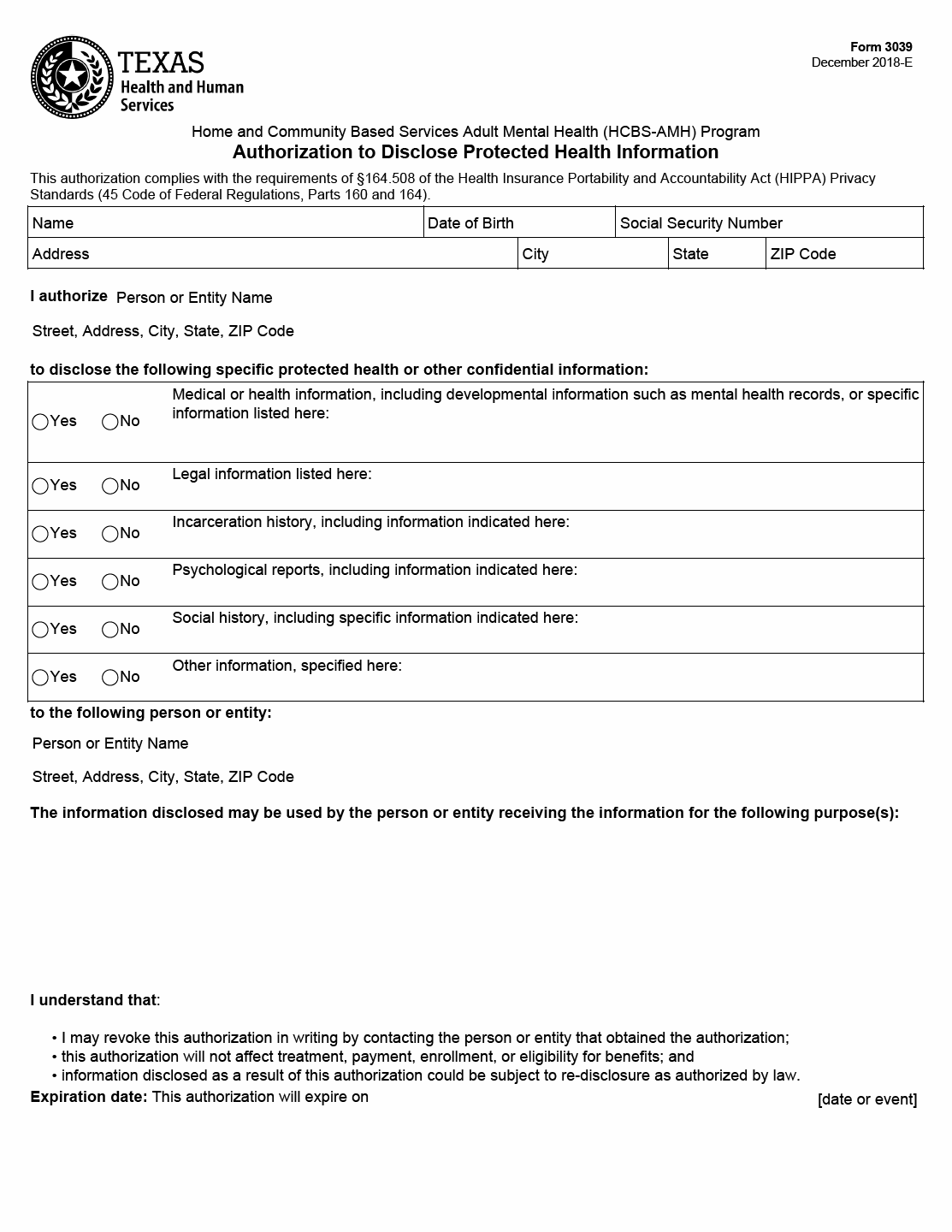 TX HHS Form 3039. Authorization to Disclose Protected Health Information