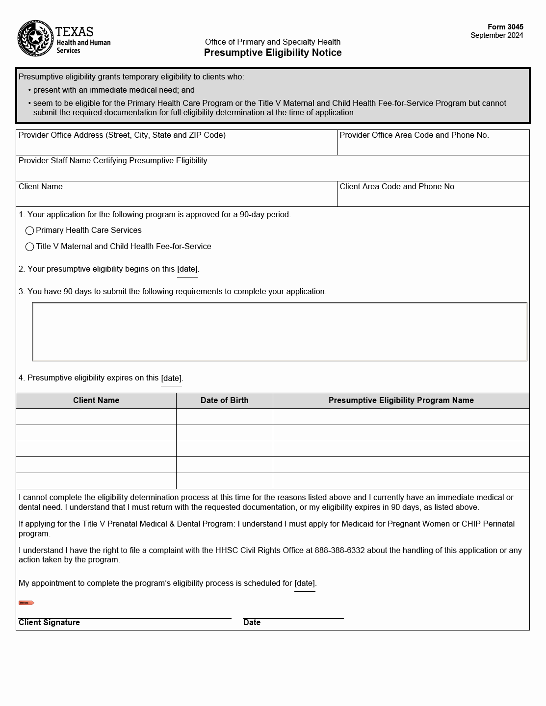 TX HHS Form 3045. Office of Primary and Specialty Health Presumptive Eligibility Notice