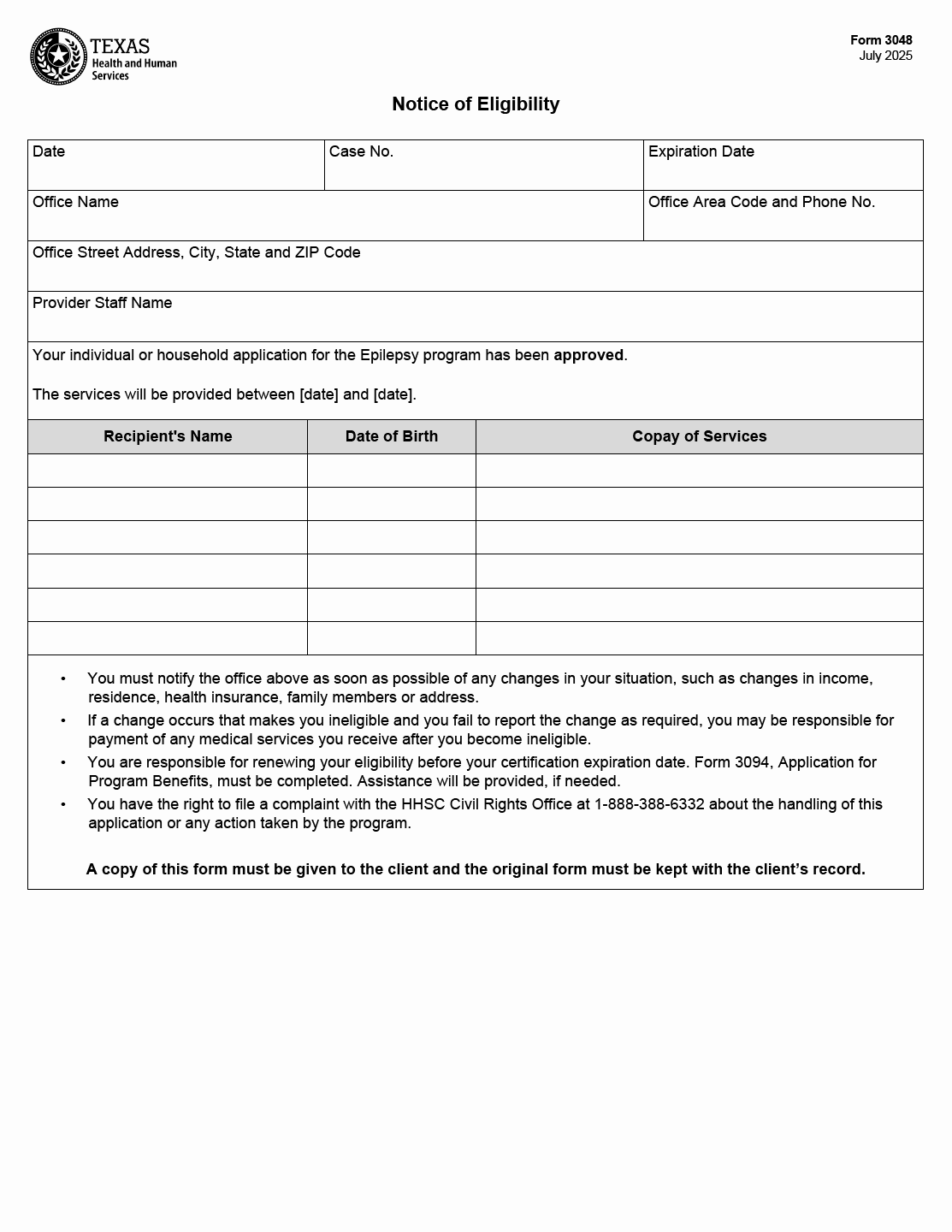 The TX HHS Form 3048 Notice of Eligibility provides essential information about the Epilepsy program's services and requirements. This document is a vital tool for individuals seeking benefits from the program. As stated in the form, recipients have the right to file complaints with the HHSC Civil Rights Office regarding the handling of their application or any action taken by the program.