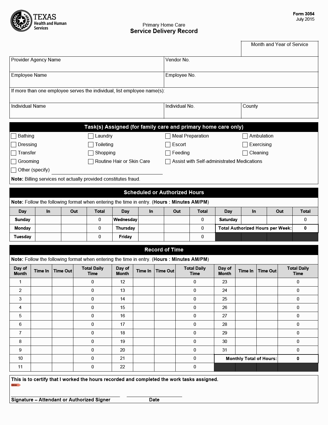 TX HHS Form 3054. Primary Home Care Service Delivery Record