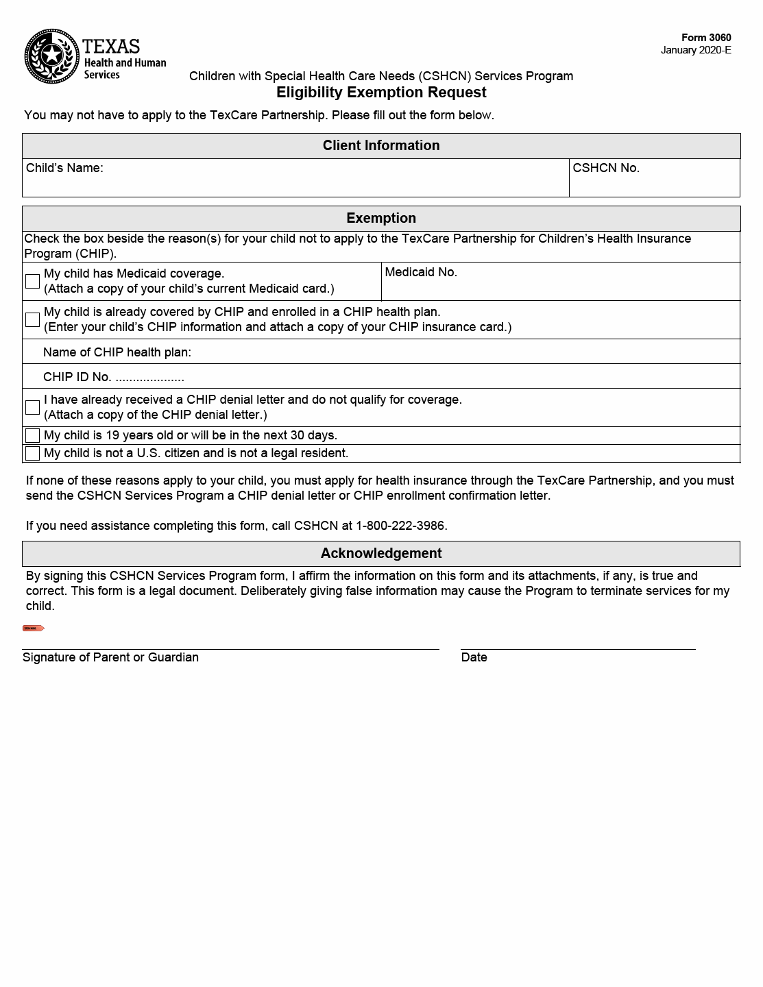TX HHS Form 3060. CSHCN Eligibility Exemption Request