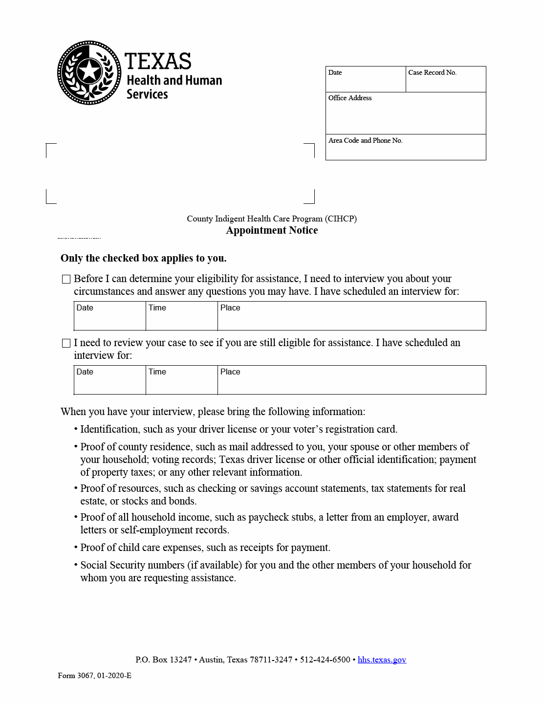 The TX HHS Form 3067, Appointment Notice, is used to schedule an interview for determining eligibility for assistance through the County Indigent Health Care Program (CIHCP). This form helps solve the problem of verifying applicant information and resources before providing aid.