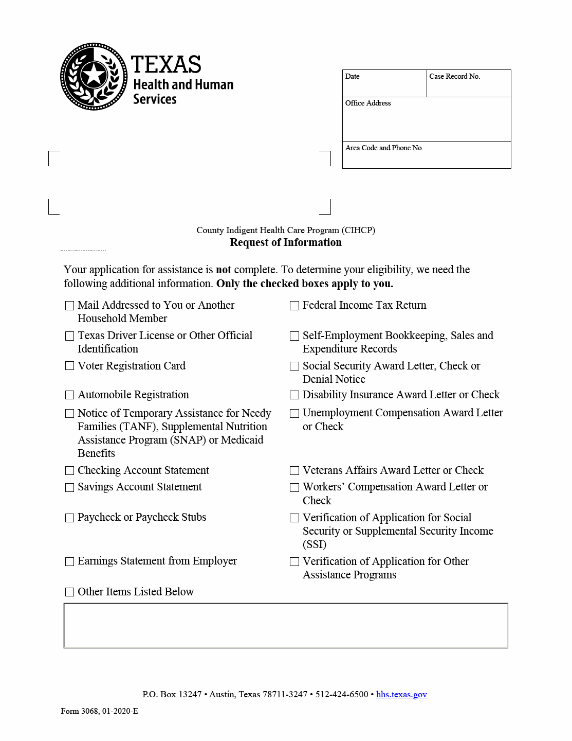 The TX HHS Form 3068, Request for Information, is used to gather essential details necessary to determine eligibility for assistance through the County Indigent Health Care Program (CIHCP). This form helps solve the problem of incomplete applications by providing a clear outline of required information.