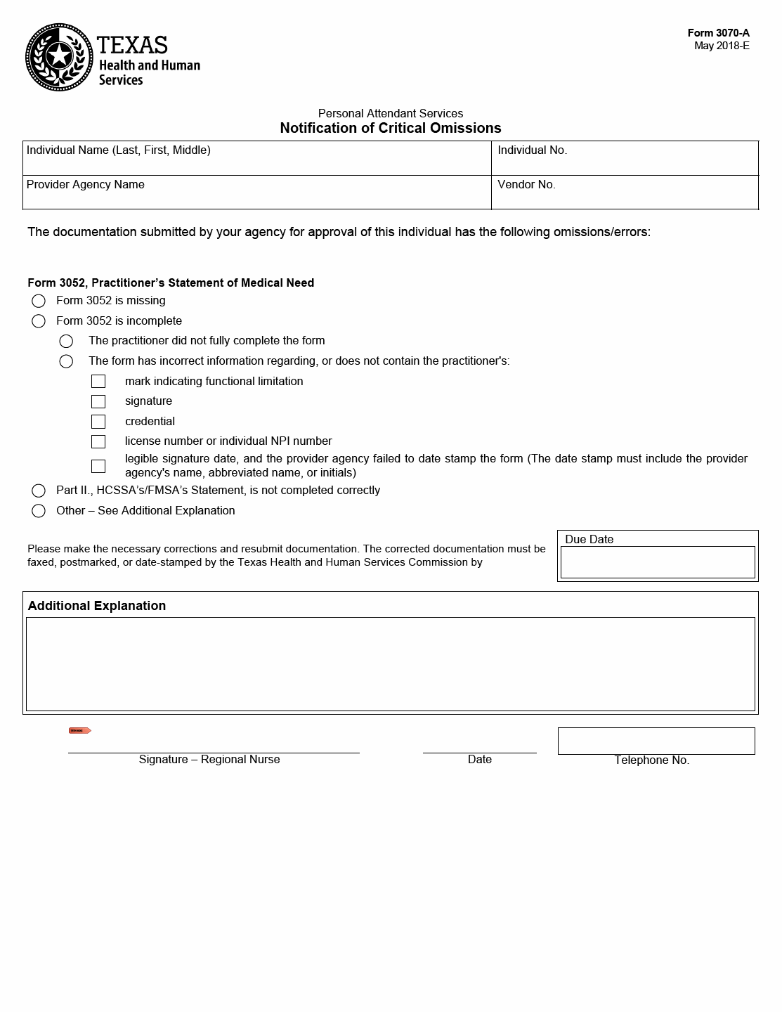 TX HHS Form 3070-A. PHC Notification of Critical Omissions and Errors in Required Documentation
