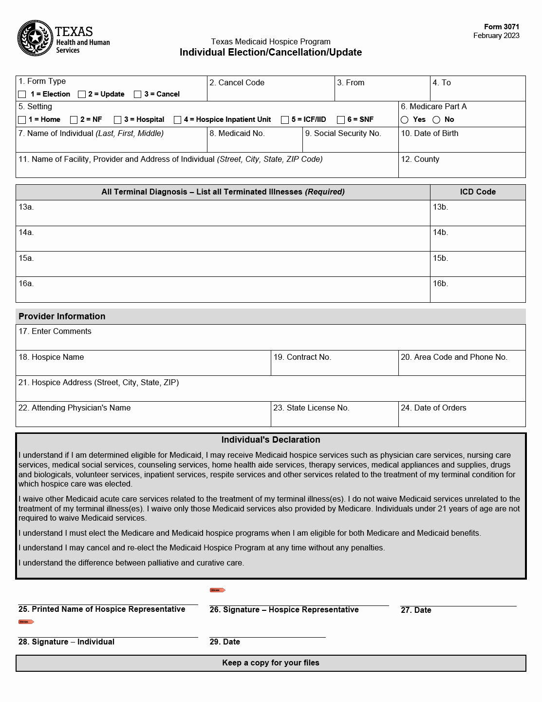 The TX HHS Form 3071, Individual Election. Cancellation or Update, is a crucial document for individuals seeking to elect, update, or cancel their Medicaid hospice services in Texas. This form helps solve the problem of ensuring that an individual's hospice care needs are accurately recorded and updated as necessary.