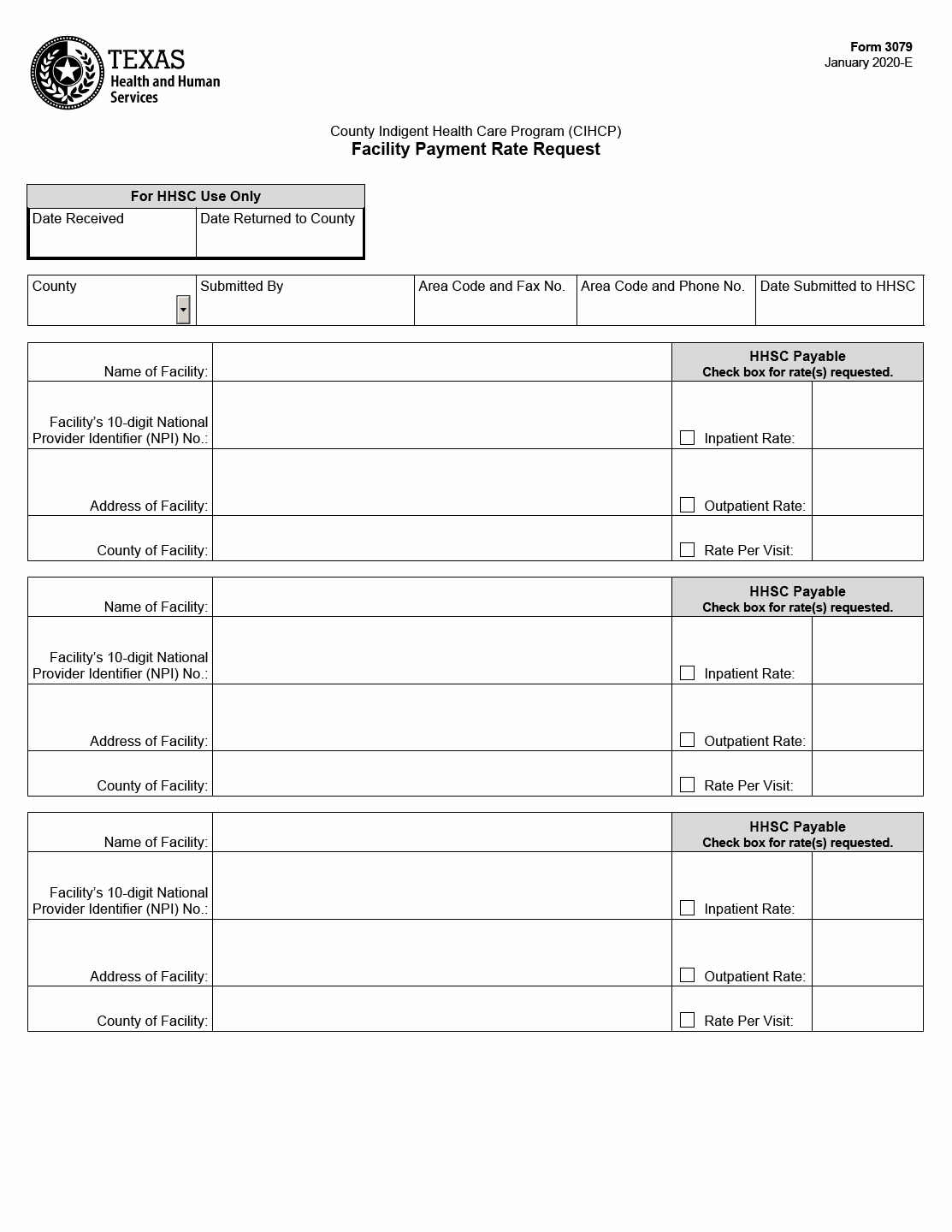TX HHS Form 3079. Facility Payment Rate Request