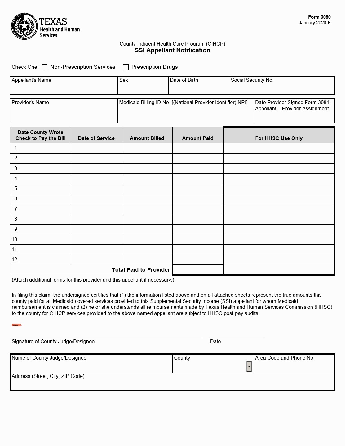 The TX HHS Form 3080, SSI Appellant Notification, is a crucial document used to notify the Texas Health and Human Services Commission (HHSC) of Medicaid-covered services provided to Supplemental Security Income (SSI) appellants. This form helps solve the problem of tracking and reporting medical expenses incurred by SSI recipients, ensuring that they receive necessary care while maintaining accurate records for reimbursement purposes.