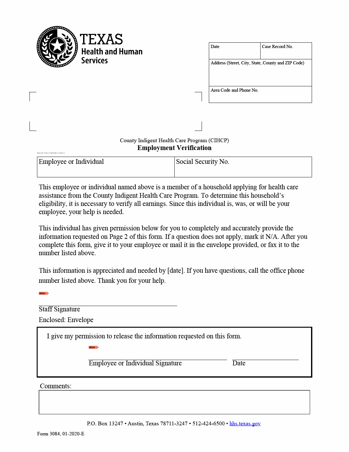 The TX HHS Form 3084, Employment Verification, is a crucial document used to verify an individual's employment status for health care assistance purposes. This form helps determine eligibility for the County Indigent Health Care Program (CIHCP) by gathering information about the individual's earnings.