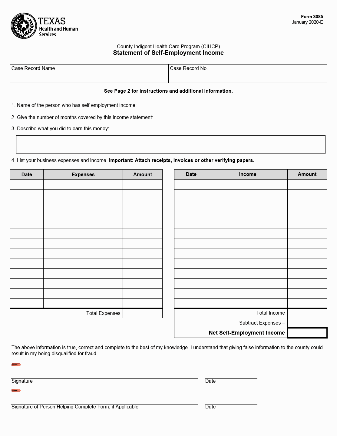The TX HHS Form 3085, "Statement of Self-Employment Income", is a crucial document for individuals who earn income through self-employment. This form helps solve the problem of accurately reporting self-employment income to the County Indigent Health Care Program (CIHCP). It should be used by individuals who have self-employment income and need to provide documentation of their earnings.