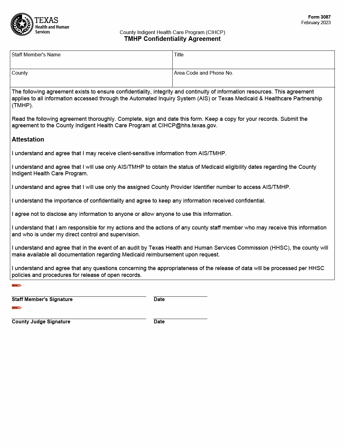 TX HHS Form 3087: TMHP Confidentiality Agreement is a crucial document that ensures confidentiality, integrity, and continuity of information resources for the County Indigent Health Care Program (CIHCP). This form applies to all information accessed through the Automated Inquiry System (AIS) or Texas Medicaid & Healthcare Partnership (TMHP), providing a framework for staff members to maintain the confidentiality of client-sensitive information.