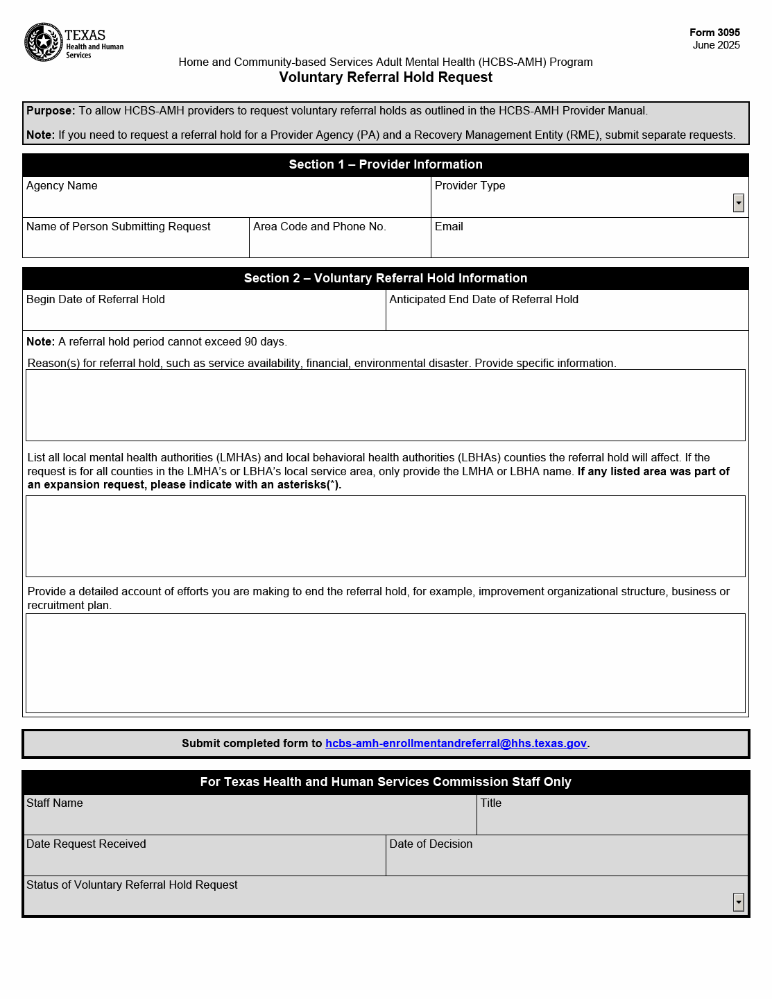TX HHS Form 3095. Home and Community-based Services Adult Mental Health (HCBS-AMH) Program Voluntary Referral Hold Request