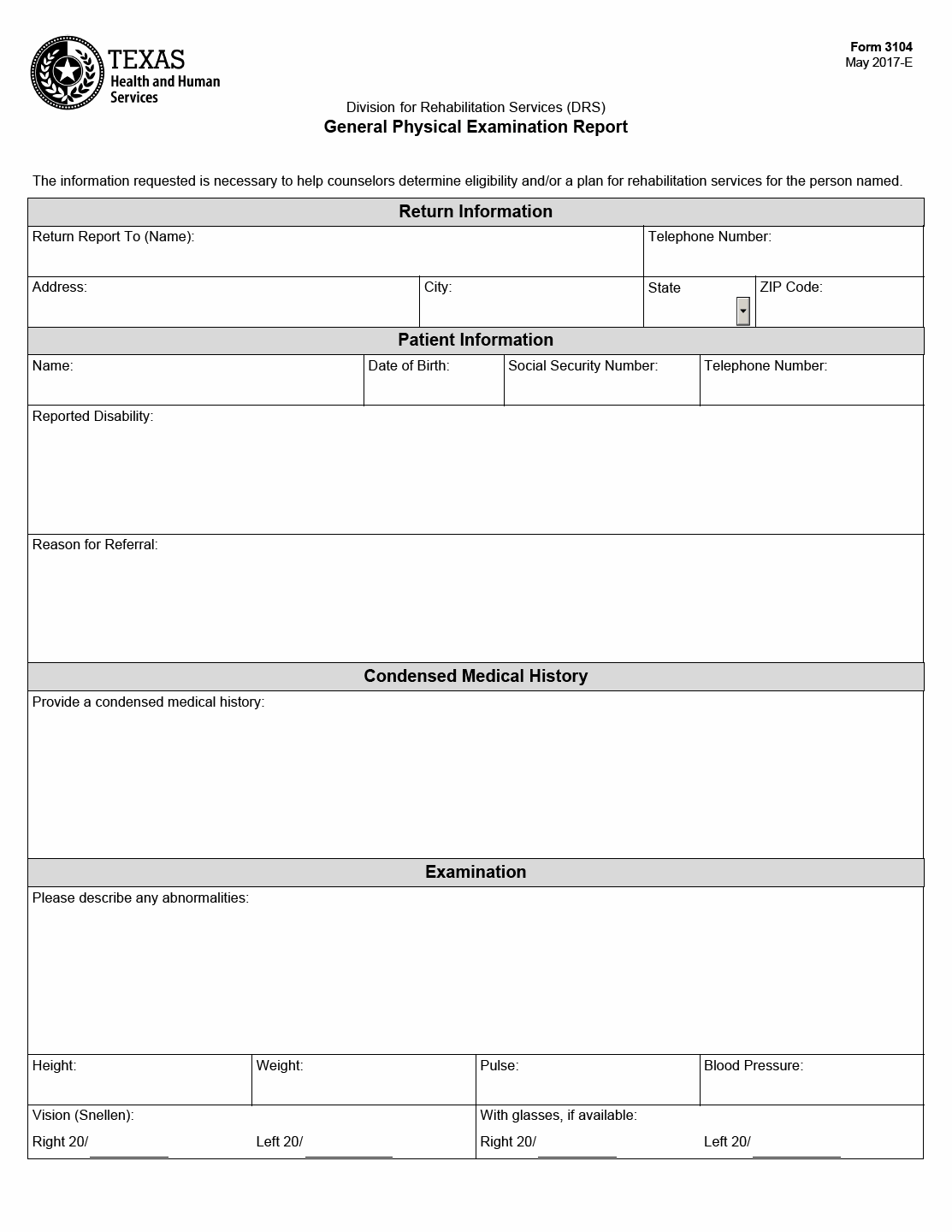The TX HHS Form 3104, General Physical Examination Report, is a crucial document used to determine eligibility for rehabilitation services or develop a plan for an individual's rehabilitation. This form helps solve the problem of assessing an individual's physical condition and identifying any reported disabilities.