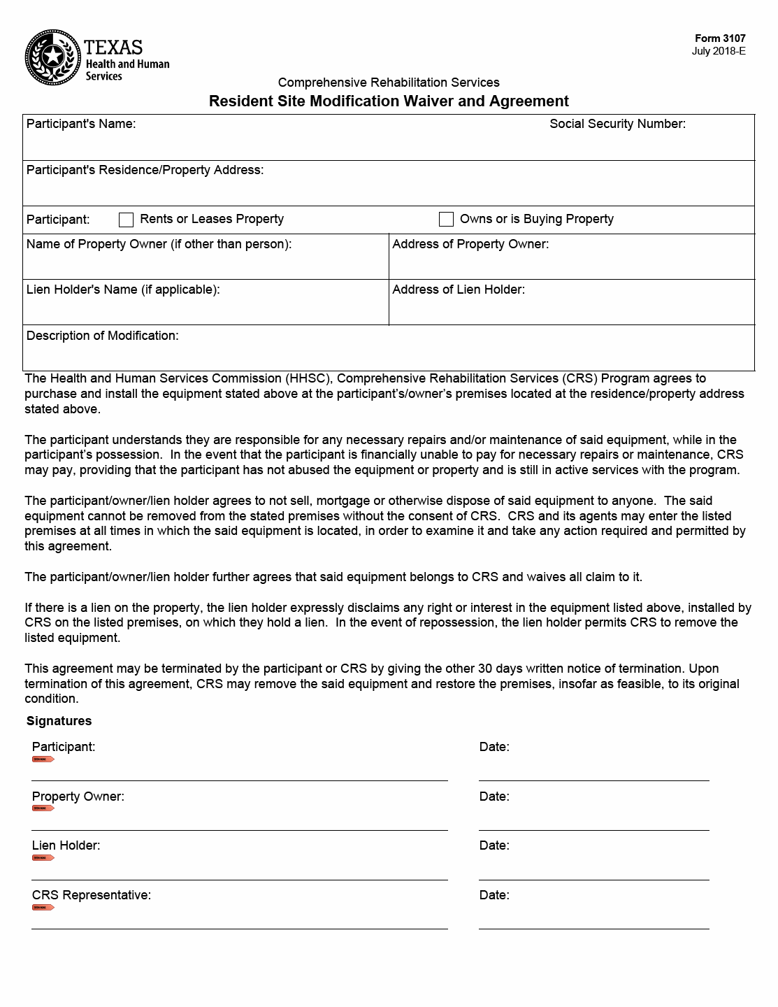 TX HHS Form 3107. Resident Site Modification Waiver and Agreement