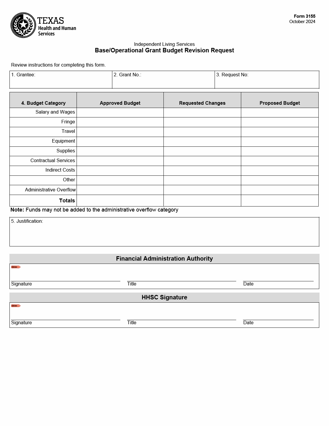 TX HHS Form 3155. Base or Operational Grant Budget Revision Request