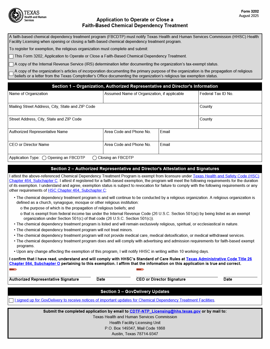 TX HHS Form 3202. Application to Operate or Close a Faith-Based Chemical Dependency Treatment