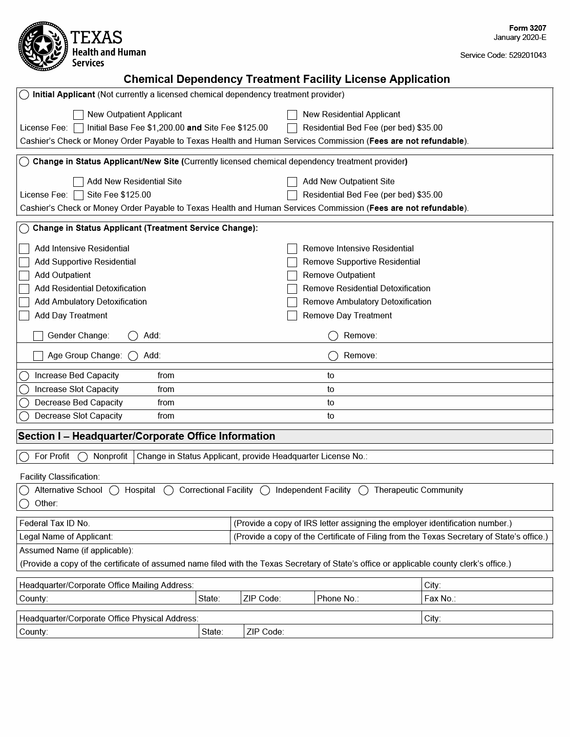 TX HHS Form 3207. Chemical Dependency Treatment Facility License Application