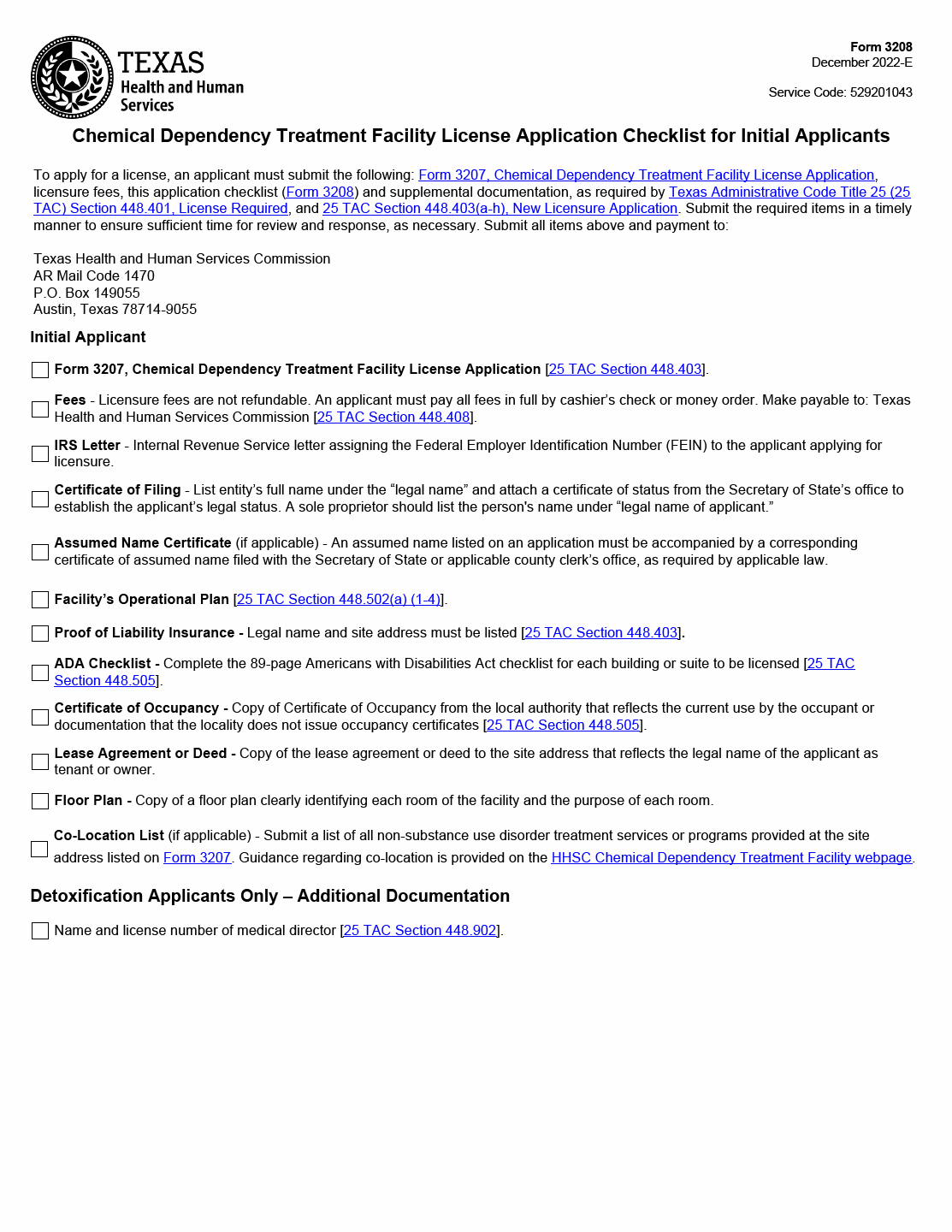 TX HHS Form 3208. Chemical Dependency Treatment Facility Licensure Application Checklist for Initial Applicants
