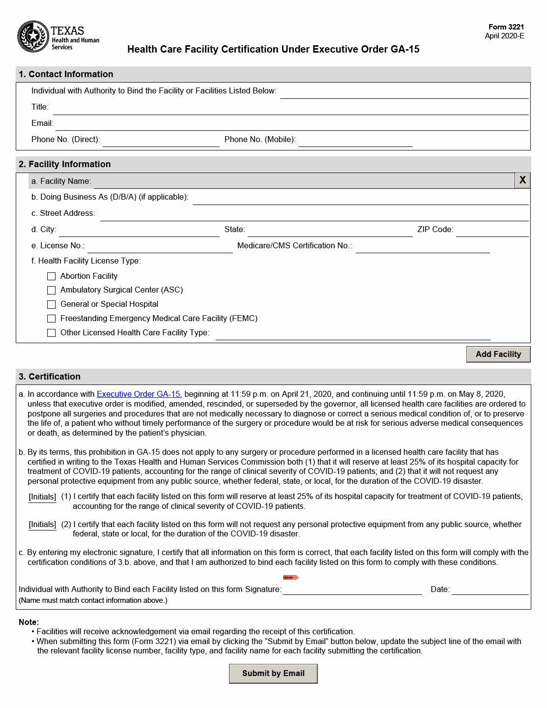TX HHS Form 3221. Health Care Facility Certification Under Executive Order GA-15