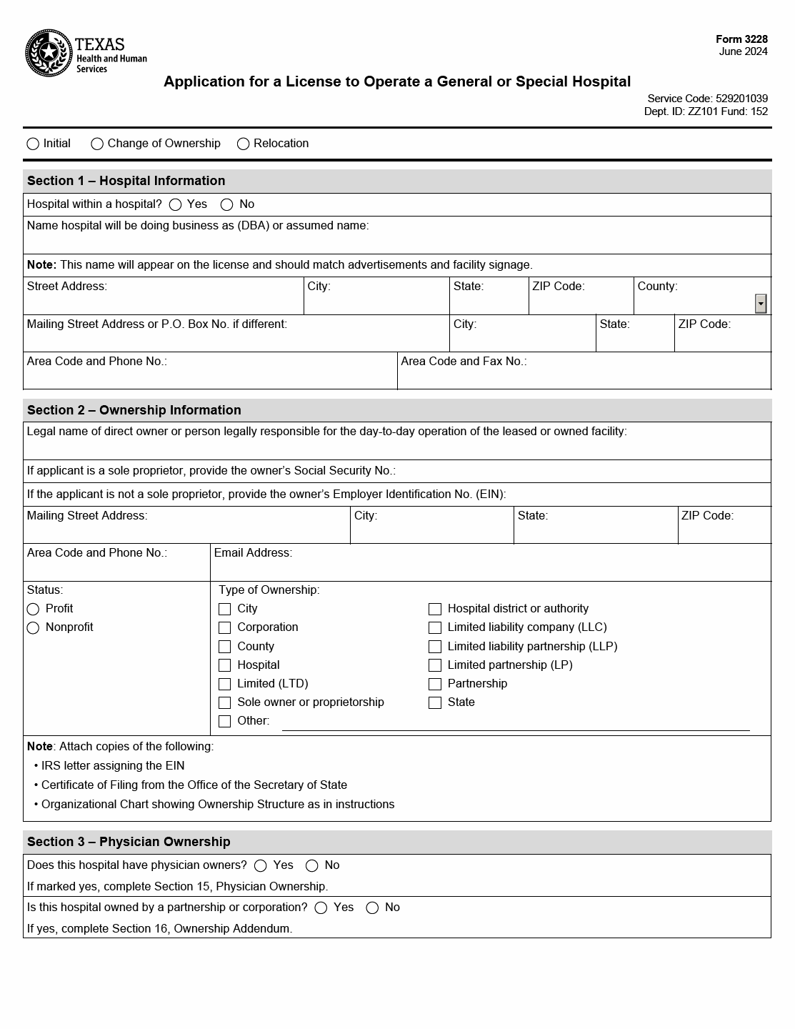 TX HHS Form 3228. Application for a License to Operate a General or Special Hospital
