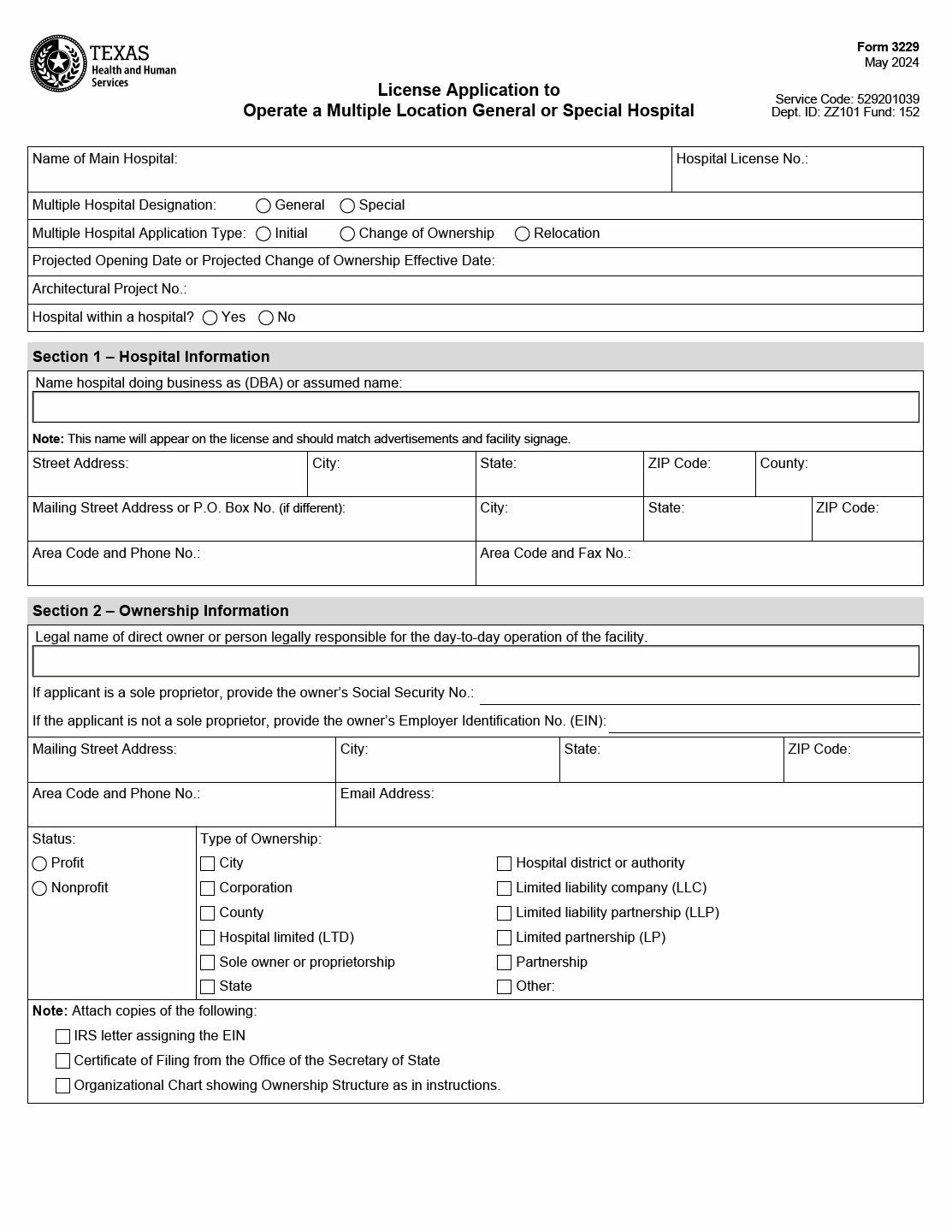 TX HHS Form 3229. License Application to Operate a Multiple Location General or Special Hospital