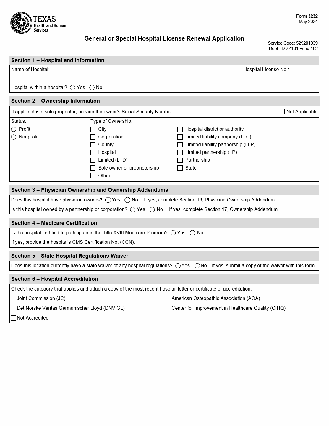 TX HHS Form 3232. General or Special Hospital License Renewal Application