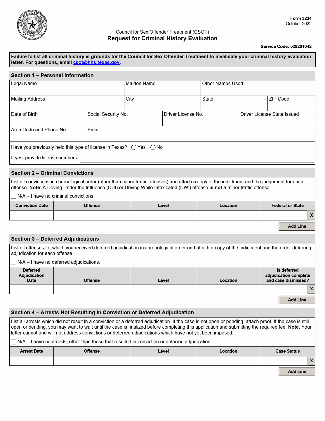 TX HHS Form 3234. Council for Sex Offender Treatment (CSOT) Request for Criminal History Evaluation