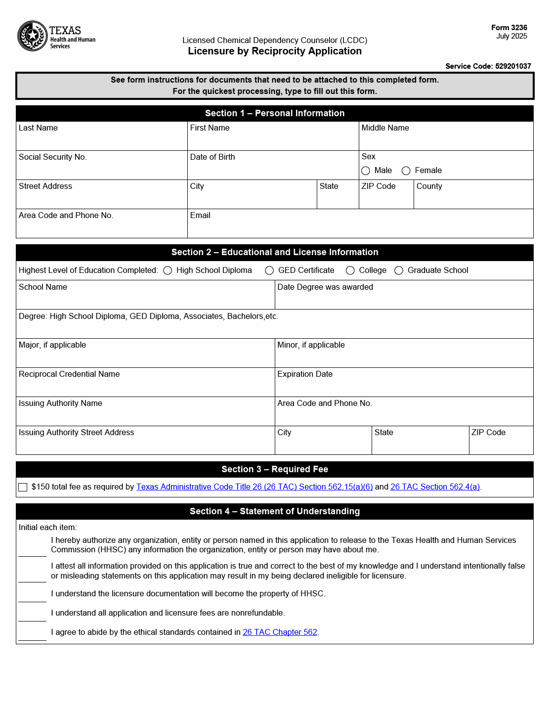 TX HHS Form 3236. Licensed Chemical Dependency Counselor Licensure by Reciprocity Application