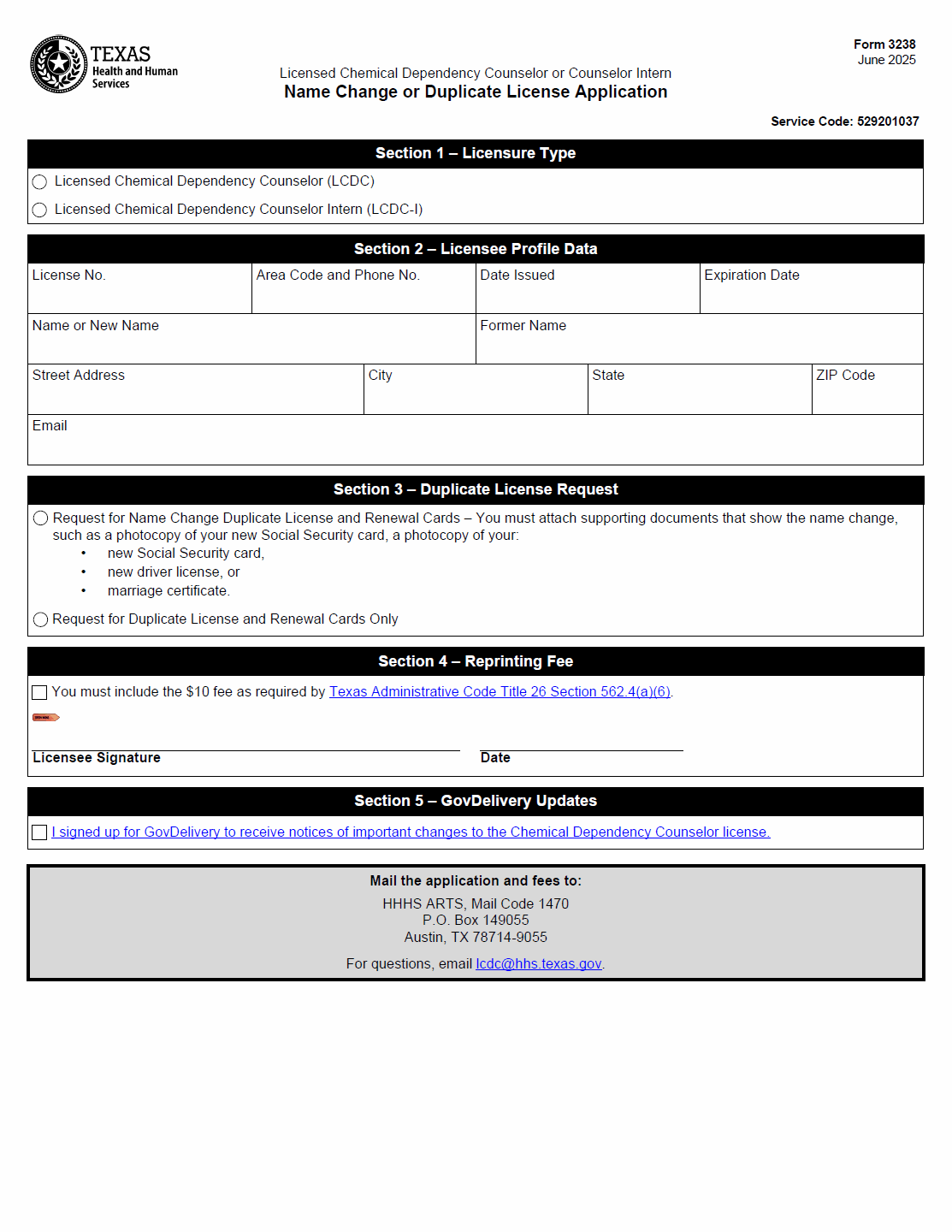 TX HHS Form 3238. Licensed Chemical Dependency Counselor or Counselor Intern Name Change or Duplicate License Application