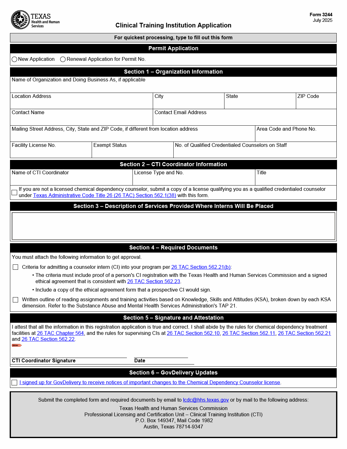 TX HHS Form 3244. Clinical Training Institution Application