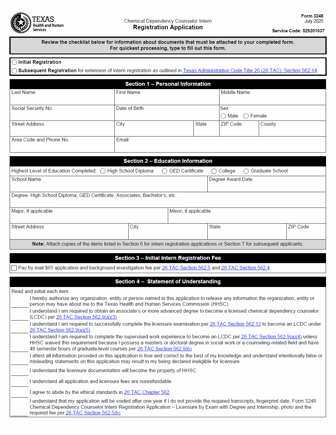 TX HHS Form 3248. Chemical Dependency Counselor Intern Registration Application
