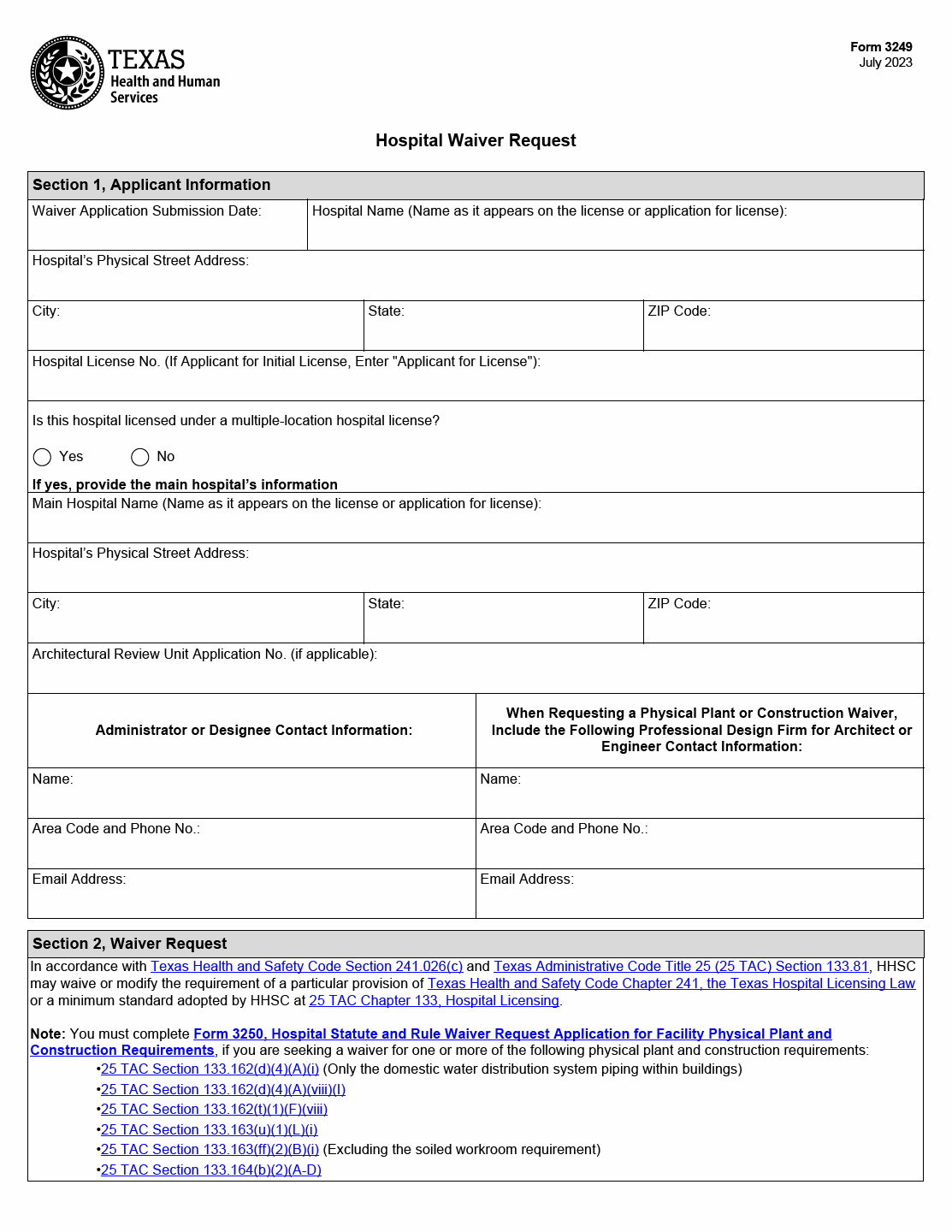 TX HHS Form 3249. Hospital Waiver Request