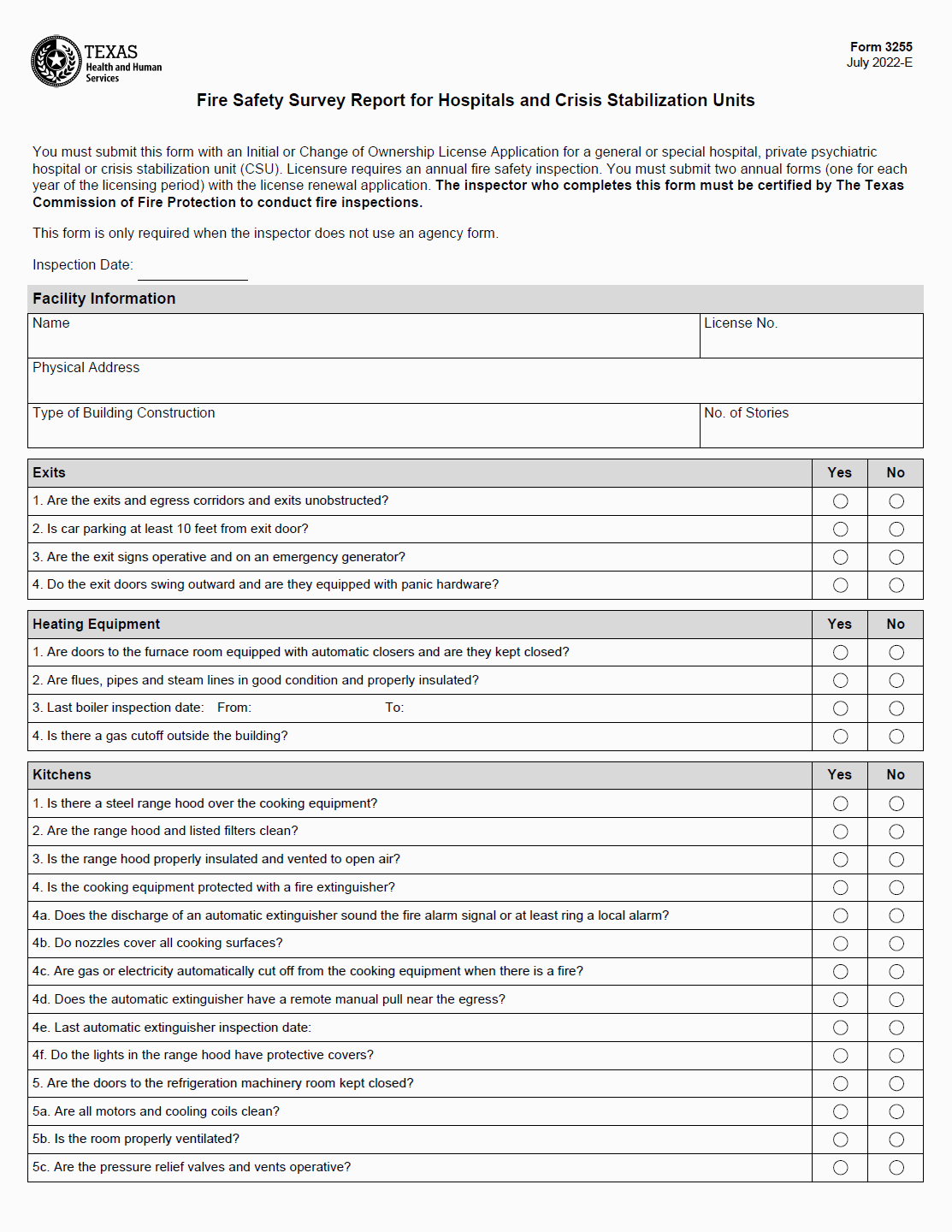 TX HHS Form 3255. Fire Safety Survey Report for Hospitals and Crisis Stabilization Units