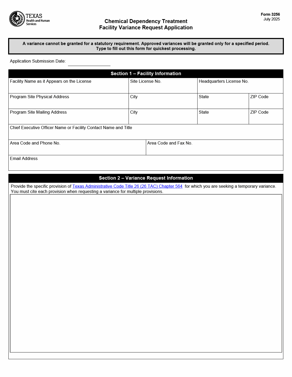 TX HHS Form 3256. Chemical Dependency Treatment Facility Variance Request Application