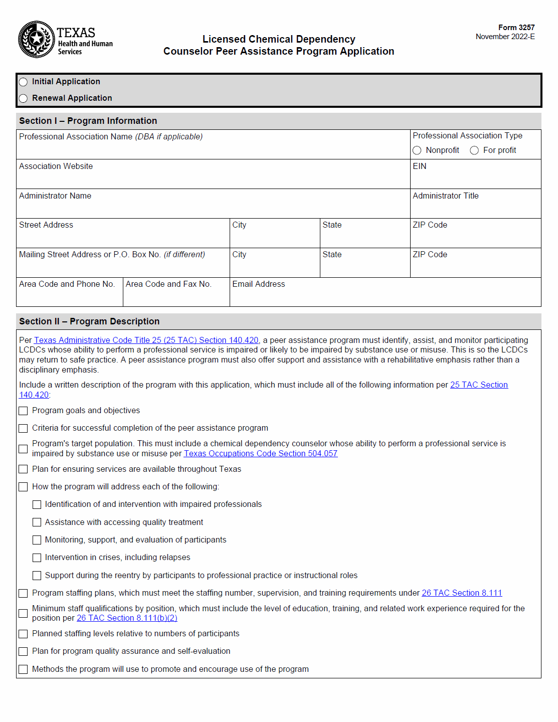 TX HHS Form 3257. Licensed Chemical Dependency Counselor Peer Assistance Program Application