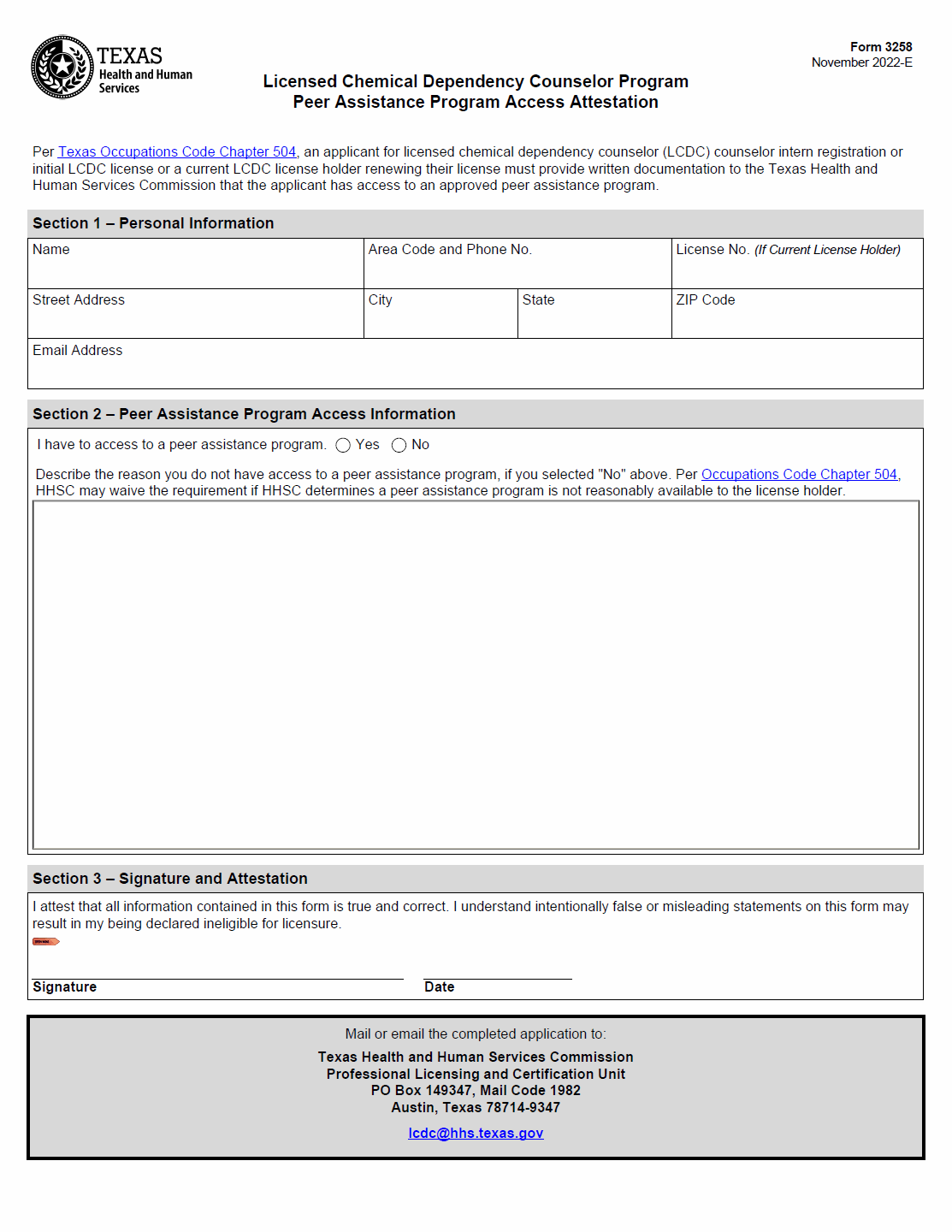 TX HHS Form 3258. Licensed Chemical Dependency Counselor Program Peer Assistance Program Access Attestation