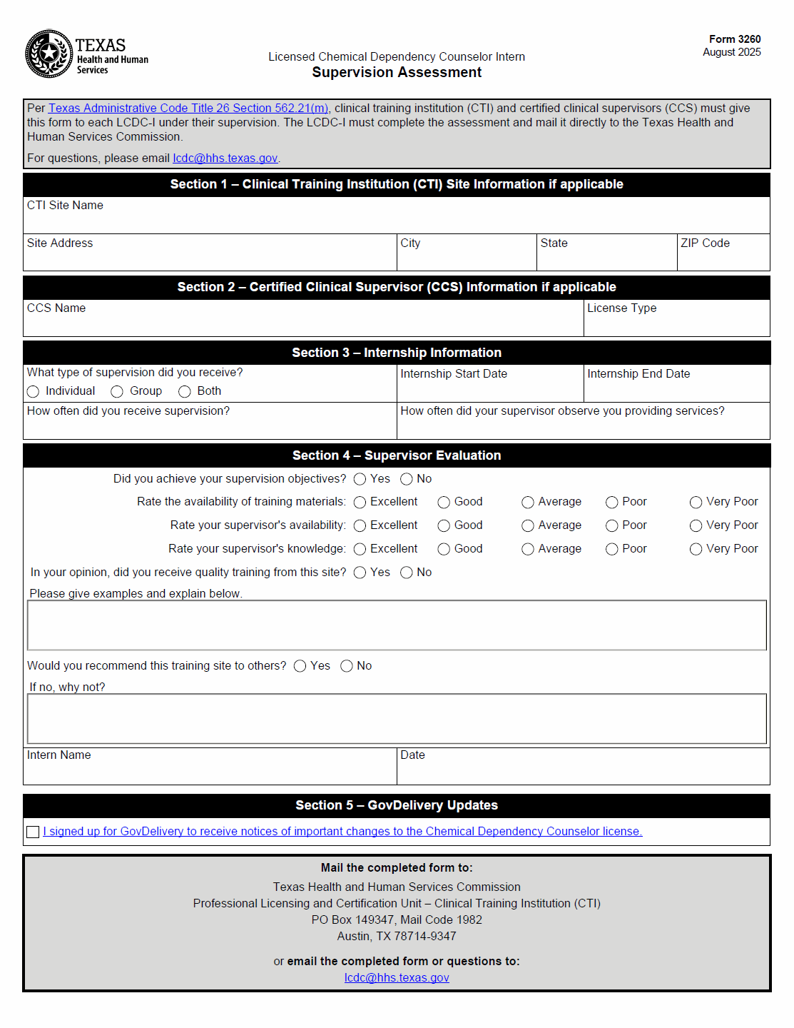 TX HHS Form 3260. Licensed Chemical Dependency Counselor Intern Supervision Assessment