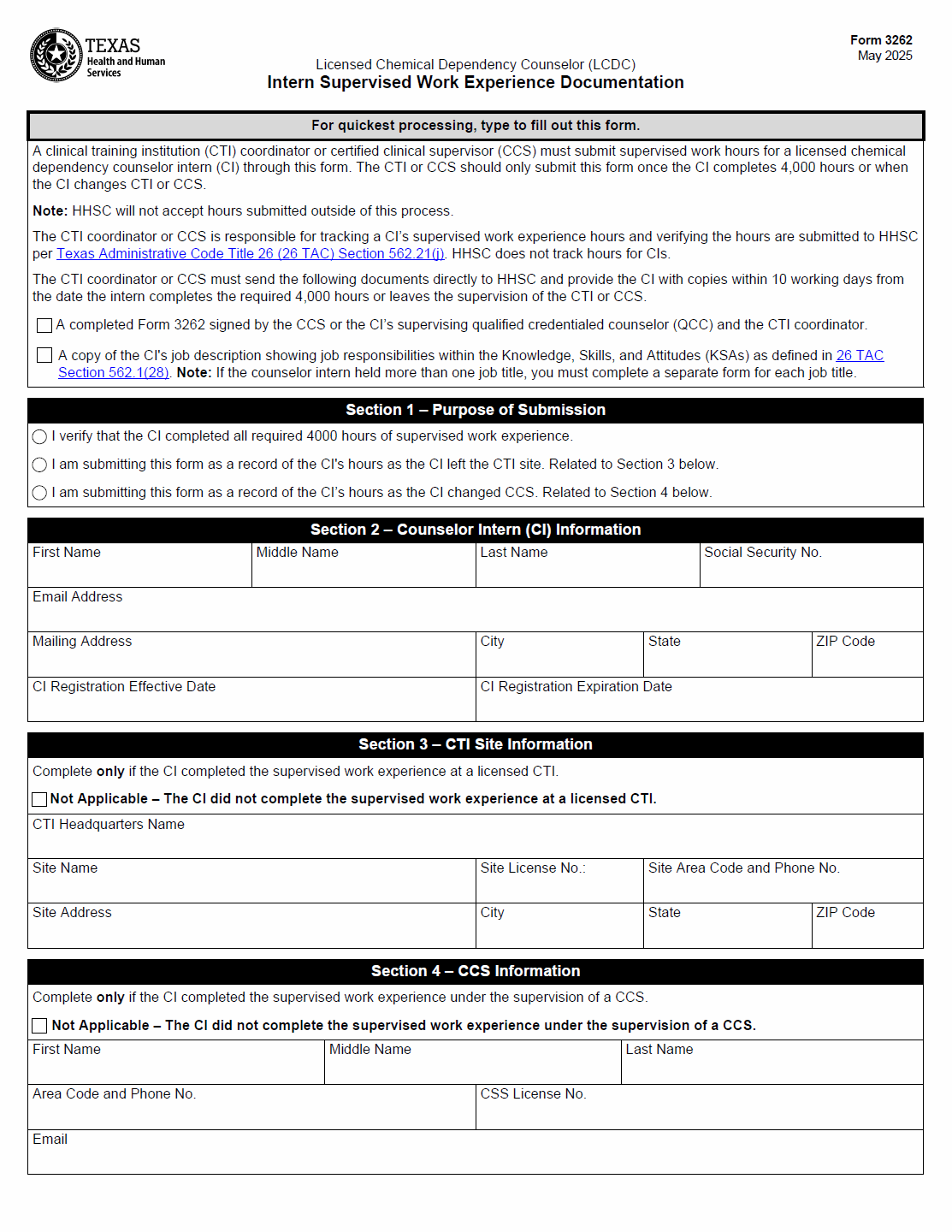 This form must be submitted by a clinical training institution (CTI) coordinator or certified clinical supervisor (CCS), and it is essential to note that HHSC will not accept hours submitted outside of this process. The form should only be completed once the LCDC has completed 4,000 hours or when they change their CTI or CCS.